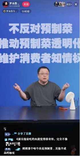 9月12日晚間,羅永浩在多平臺同步直播,開播僅10分鐘其抖音直播間觀看人數(shù)已超10萬。羅永浩在直播中以西貝使用的“凍海鱸魚”舉例,認為食用這種經(jīng)過深度工業(yè)化處理的食材與大眾去餐廳追求新鮮的初衷顯然不符,且稱西貝“是所有賣預制菜餐廳里賣最貴的”。羅永浩強調,預制菜還沒有正式的國家標準,不反對預制菜,而是主張“推動中國預制菜行業(yè)透明化、保障消費者的知情權”,并點贊了餐飲品牌老鄉(xiāng)雞公示菜品區(qū)分“現(xiàn)做”“半預制”“預制”加工等級的舉措。