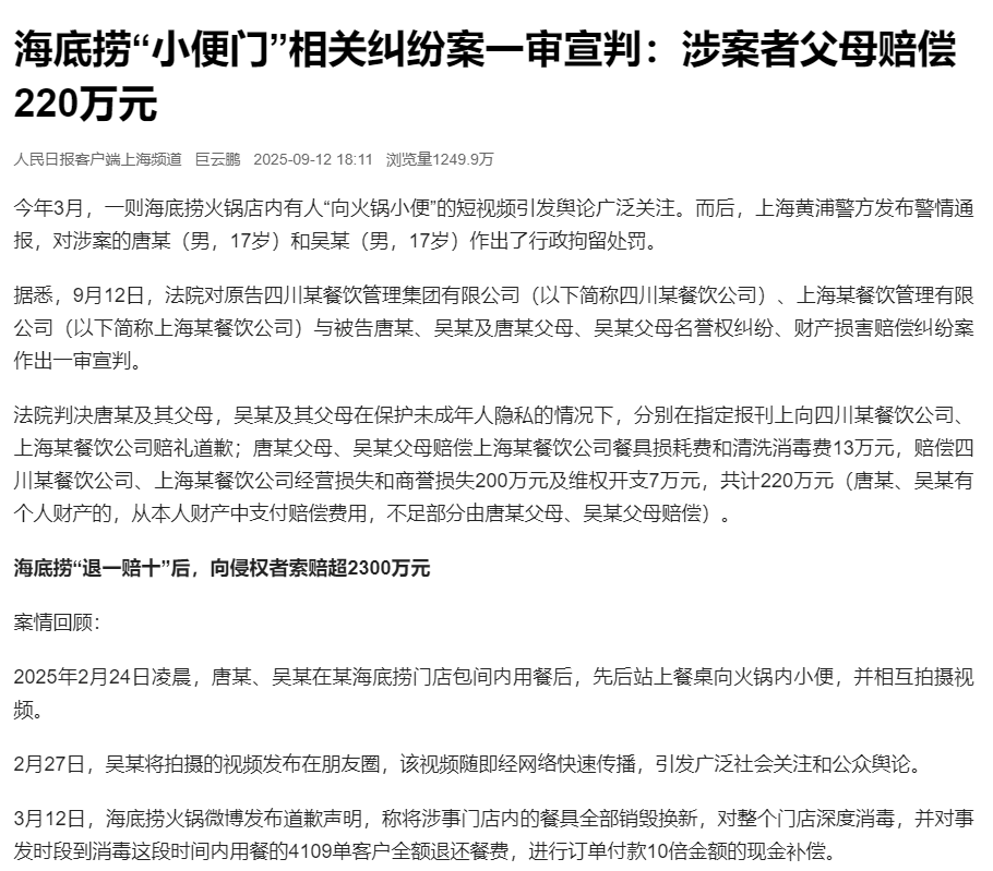半年前引發(fā)廣泛討論的海底撈“小便門”事件近日迎來新進展。據(jù)人民日報客戶端報道,9月12日,上海市黃浦區(qū)人民法院對海底撈“小便門”相關糾紛案作出一審判決,肇事者唐某、吳某及各自父母在保護未成年人隱私的情況下,分別在指定報刊上賠禮道歉;賠償餐具損耗費和清洗消毒費13萬元、經(jīng)營損失和商譽損失200萬元及維權開支7萬元,共計220萬元,唐某、吳某有個人財產(chǎn)的,從本人財產(chǎn)中支付賠償費用,不足部分由唐某父母、吳某父母賠償。