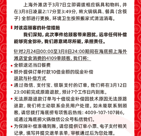 (海底撈對消費者“退一賠十”聲明截圖 來源:海底撈火鍋官方微博)