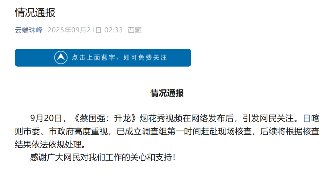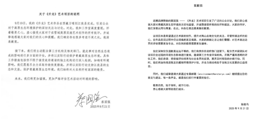 21日凌晨,日喀則市互聯(lián)網(wǎng)信息辦公室發(fā)布情況通報稱,日喀則市委、市政府已成立調(diào)查組第一時間趕赴現(xiàn)場核查,后續(xù)將根據(jù)核查結(jié)果依法依規(guī)處理。當日,蔡國強工作室、始祖鳥分別發(fā)布致歉說明,蔡國強表示將“盡全力采取補救恢復(fù)措施”,始祖鳥則稱將邀第三方評估并依結(jié)果補救,同時推進藏地環(huán)保計劃與文化公益項目。