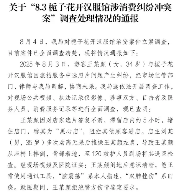 8月7日,西安市公安局雁塔分局官微“@雁塔公安”通報稱已立案開展調(diào)查。8月9日,“@雁塔公安”發(fā)布詳細(xì)調(diào)查通報,還原事實真相。通報稱,涉事女子王某顏因?qū)Φ昙疫x片答復(fù)不滿,滯留店內(nèi)約5小時,堵住店門,阻攔其他顧客進店。店主劉某多次勸離無果后推搡王某顏左肩,導(dǎo)致王某顏從座椅上摔倒。經(jīng)現(xiàn)場視頻及醫(yī)院證實:王某顏倒地后意識清晰,能正常使用通訊工具,“腦震蕩”系本人描述,“雙肺挫傷”系舊疾。王某顏在警方調(diào)查期間,為制造輿論壓力、博取網(wǎng)友同情,刻意隱瞞民警兩次組織雙方調(diào)解、同行人員情況、就醫(yī)期間多次外出等事實,聯(lián)系并利用媒體,持續(xù)在網(wǎng)絡(luò)上發(fā)布“被毆打致昏迷”“民警未做筆錄、勾連商家”“孩子挨餓無人照顧”等不實信息,造成嚴(yán)重影響。王某顏涉嫌尋釁滋事被處六日拘留處罰,店主劉某涉嫌故意傷害他人被處五日拘留處罰。該通報發(fā)出后輿論反轉(zhuǎn),多數(shù)網(wǎng)民點贊當(dāng)?shù)鼐揭婪ㄌ幹?,批評個別媒體失實傳播,部分輿論還圍繞消費維權(quán)失度、網(wǎng)絡(luò)言論責(zé)任等深層問題展開探討。截至8月28日12時,全網(wǎng)相關(guān)信息3.2萬余條,“#西安漢服館沖突雙方被拘留#”等微博話題閱讀量約5000萬。