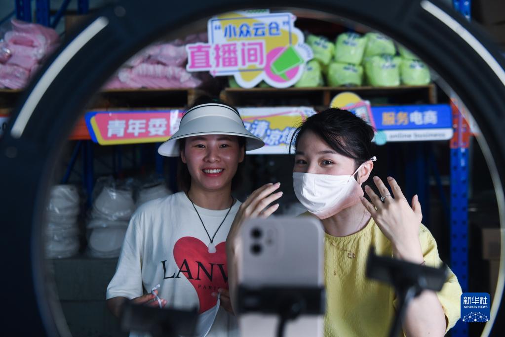 6月27日,在義烏市蘇溪鎮(zhèn)愛德瑪電商園的“小眾云倉”站點內(nèi),工作人員在進行夏季防曬用品直播銷售。