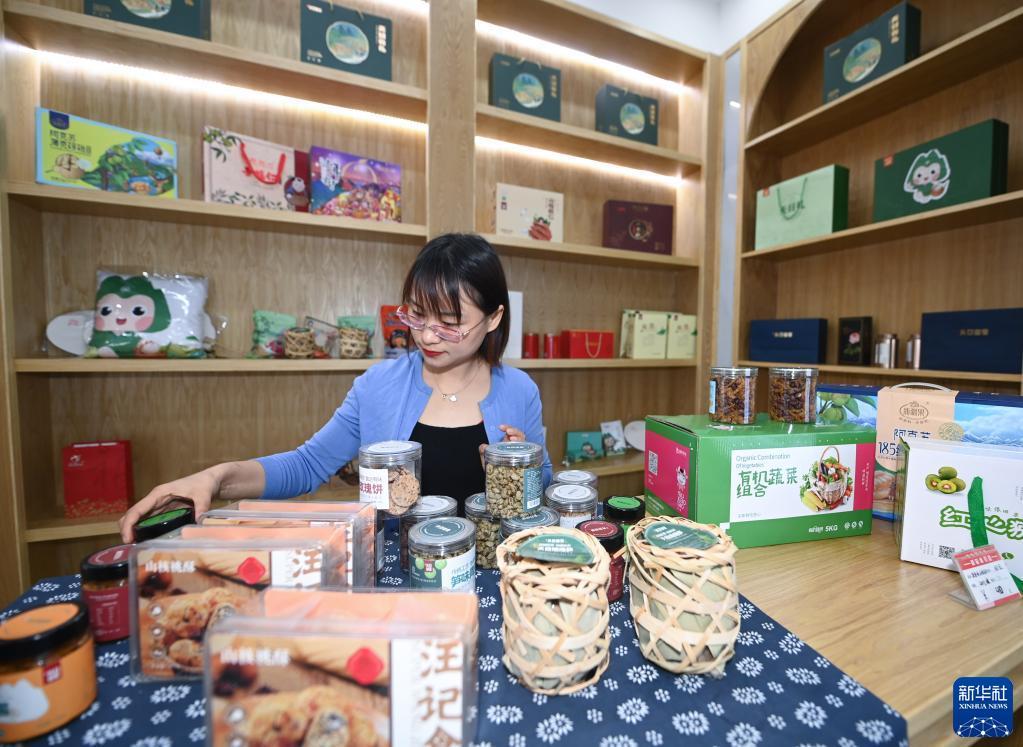 4月20日,在昌化鎮(zhèn)白牛村,青年創(chuàng)客張青整理要進行直播銷售的特色農產品。記者 徐昱 攝