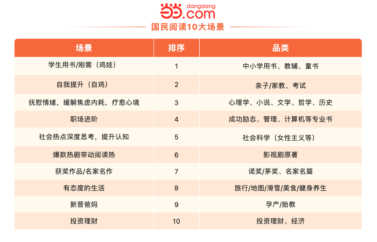閱讀是大腦的有氧運(yùn)動(dòng),卻自帶阻力。在現(xiàn)實(shí)生活中,想不起來閱讀,想起來閱讀不知道讀什么書,是當(dāng)下閱讀推廣面臨的主要問題。結(jié)合品類和爆款書的消費(fèi)趨勢(shì),當(dāng)當(dāng)網(wǎng)發(fā)布“國(guó)民閱讀10大場(chǎng)景”,以期提醒更多讀者想起閱讀,想起書。