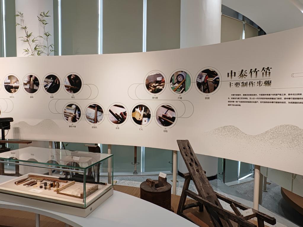 紫荊村擁有2.8萬(wàn)畝苦竹林,年產(chǎn)苦竹1.6萬(wàn)噸,年產(chǎn)竹笛300萬(wàn)支,是國(guó)內(nèi)著名的“竹笛之鄉(xiāng)”。2020年底,中泰街道和紫荊村將以前的竹器廠進(jìn)行改造,建起了這座以笛文化為主題的鄉(xiāng)村博物館。從空中向下望去,博物館就如同鑲嵌在村居竹林間的一個(gè)音符。村黨委書記鮑明遠(yuǎn)告訴記者,以展示館為中心,村里還建起了竹笛主題沉浸式音樂(lè)廣場(chǎng)和竹笛非遺工坊,推動(dòng)文旅融合,更好地展示笛文化。