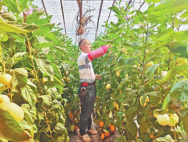 周明亮查看人參果長勢。記者 于曉明 攝