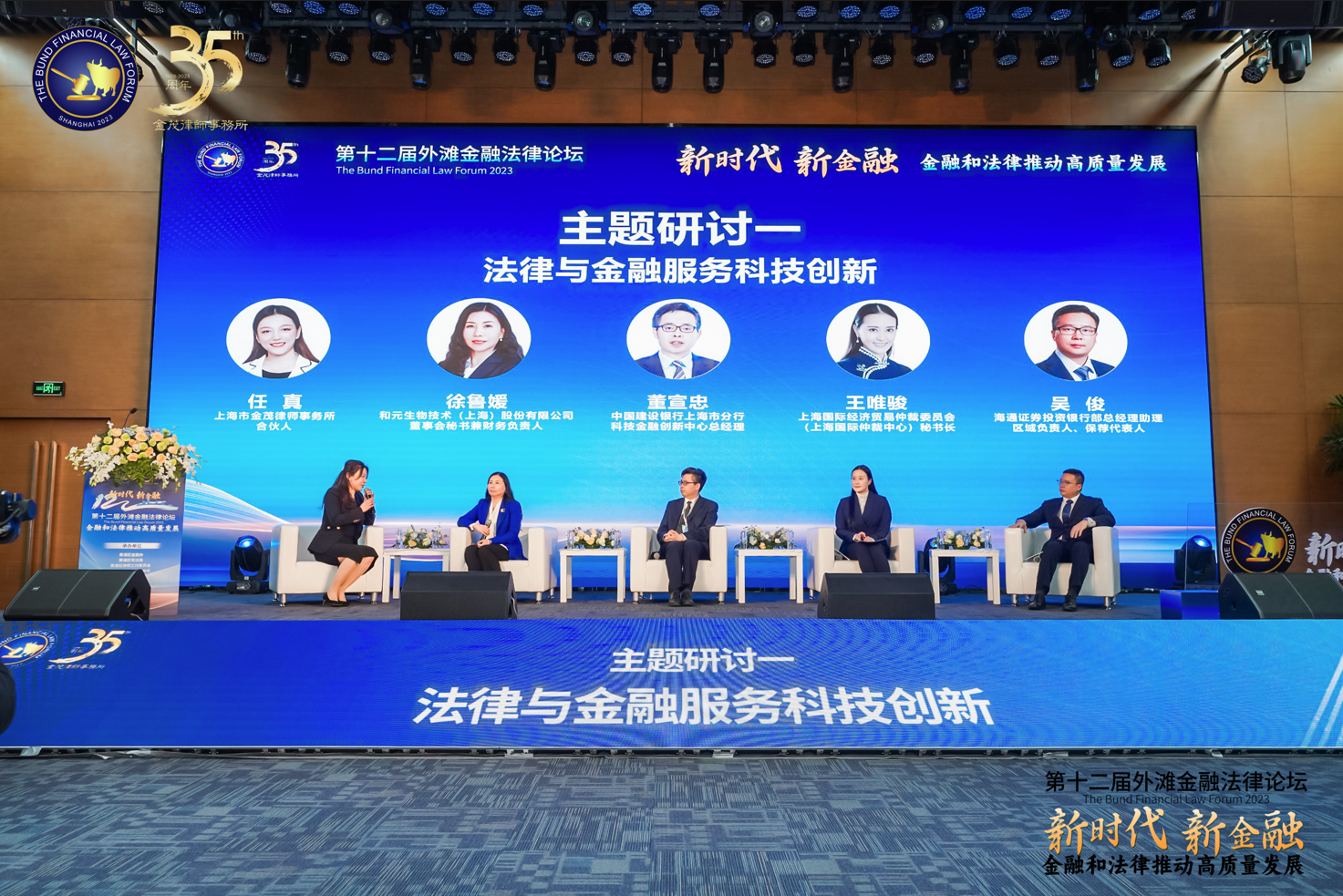“法律與金融服務(wù)科技創(chuàng)新”主題研討環(huán)節(jié),由上海市金茂律師事務(wù)所合伙人任真律師主持,來自海通證券股份有限公司上海投資銀行部總經(jīng)理助理吳俊先生、上海國際經(jīng)濟貿(mào)易仲裁委員會(上海國際仲裁中心)秘書長王唯駿女士、中國建設(shè)銀行上海市分行科技金融創(chuàng)新中心總經(jīng)理董宣忠先生、和元生物技術(shù)(上海)股份有限公司董事會秘書兼財務(wù)負(fù)責(zé)人徐魯媛女士共同參與研討。