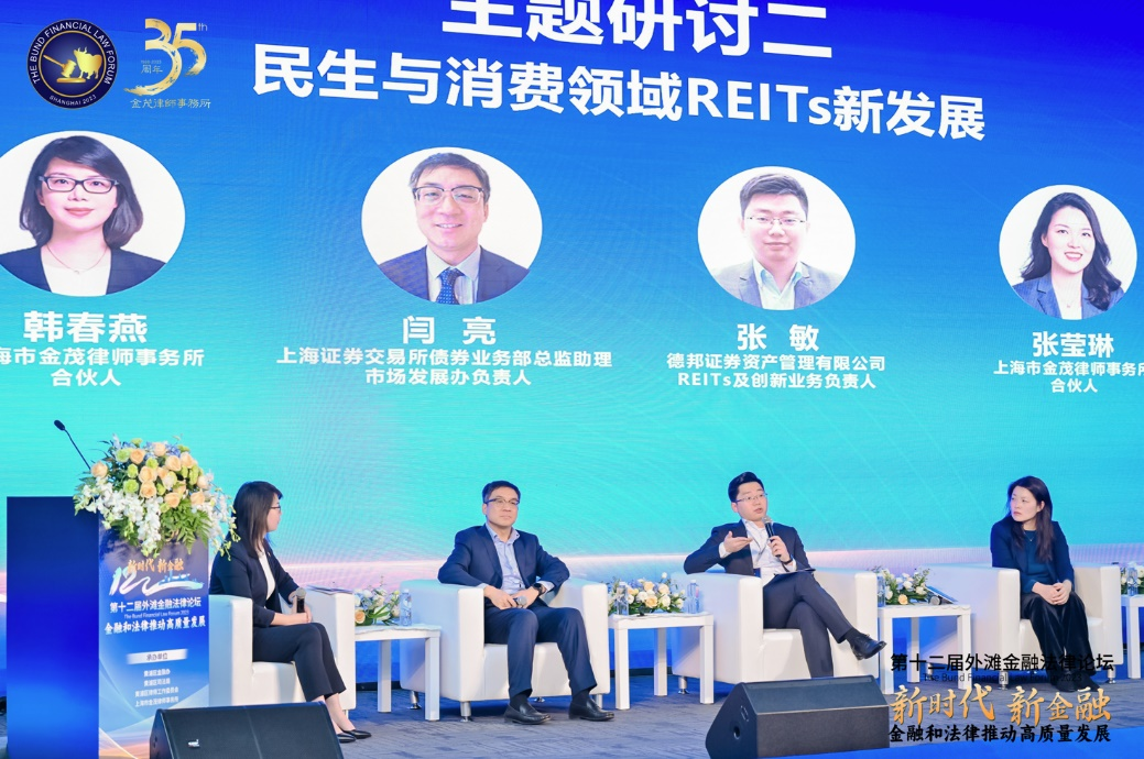 “民生與消費領(lǐng)域REITs新發(fā)展”主題研討環(huán)節(jié),由上海市金茂律師事務(wù)所合伙人韓春燕律師主持,來自上海證券交易所債券業(yè)務(wù)部總監(jiān)助理、市場發(fā)展辦負(fù)責(zé)人閆亮先生、德邦證券資產(chǎn)管理有限公司REITs及創(chuàng)新業(yè)務(wù)負(fù)責(zé)人先生、上海市金茂律師事務(wù)所合伙人張瑩琳律師共同參與研討。