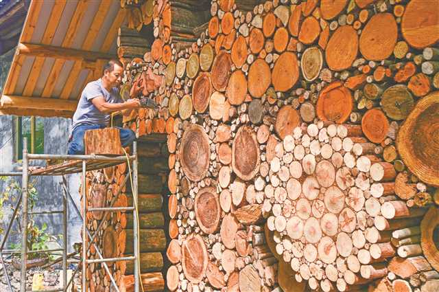 酉陽(yáng)花田鄉(xiāng)何家?guī)r村,工人正在搭建木藝墻,讓藝術(shù)融入鄉(xiāng)村 特約攝影 冉川
