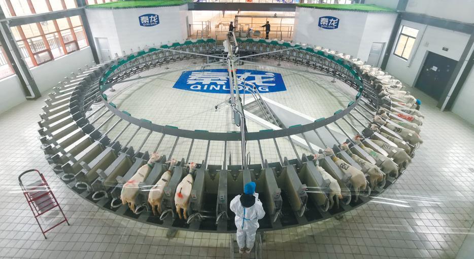 當(dāng)日9時(shí),到了給奶山羊擠奶時(shí)間,羊群通過單向趕羊通道有序進(jìn)入百位轉(zhuǎn)盤式智能擠奶設(shè)備完成每日的產(chǎn)奶任務(wù)?!拔覀兪褂玫陌傥晦D(zhuǎn)盤式智能擠奶設(shè)備,實(shí)現(xiàn)了每100只羊從清洗到完成擠奶僅需10分鐘,擠奶效率大幅提升?!庇谇邎@說。