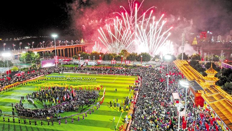 19時30分,澳門職工聯(lián)隊與貴州村超聯(lián)隊友誼賽結(jié)束后,“村超村晚”文藝展示又將整場活動推向高潮。這場晚會由民風民俗展新顏、鄉(xiāng)村足球超快樂、貴山貴水迎貴客、龍騰盛世慶豐年4個篇章組成,參演演員近2300人。據(jù)相關(guān)負責人介紹,此次文藝展示的內(nèi)容均以榕江“村超”自創(chuàng)節(jié)目為主,同時,澳門舞醉龍表演隊在龍騰盛世慶豐收環(huán)節(jié)與貴州的舞龍隊伍共同演出,展示出兩地文化的互通互融。本次文藝展示強調(diào)“草根”和民族文化,吸引了上萬人現(xiàn)場觀看,在演出的尾聲,一場持續(xù)10余分鐘的煙花秀點亮了榕江縣的夜空,“文化味、民族味、傳承味、年味”十足的“村超村晚”在觀眾和游客的掌聲與歡呼聲中落下帷幕。