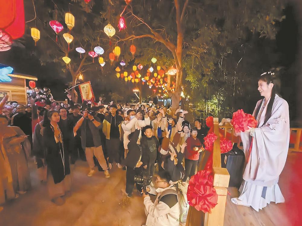 為讓游客有更好的文化體驗(yàn),今年元宵節(jié),杏陳鎮(zhèn)聯(lián)合磁窯村策劃了“浪漫元宵·緣定磁窯”沉浸式漢服游園會(huì)。當(dāng)晚,身著各式漢服的演員們穿梭在各個(gè)景點(diǎn),用“舞蹈+情景劇”的方式為游客獻(xiàn)上民族舞、古箏演奏、拋繡球等精彩表演。