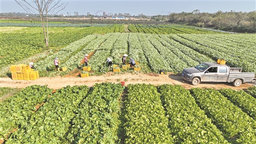在廣西農(nóng)啟生態(tài)農(nóng)業(yè)科技有限公司的果蔬分揀中心,50多名工人正對收購上來的蔬菜進行分揀、打包。公司總經(jīng)理戴開旺介紹,公司和當?shù)氐?0多家合作社、種植大戶簽訂收購協(xié)議,去年冬種以來,共收購各類蔬菜約535噸。