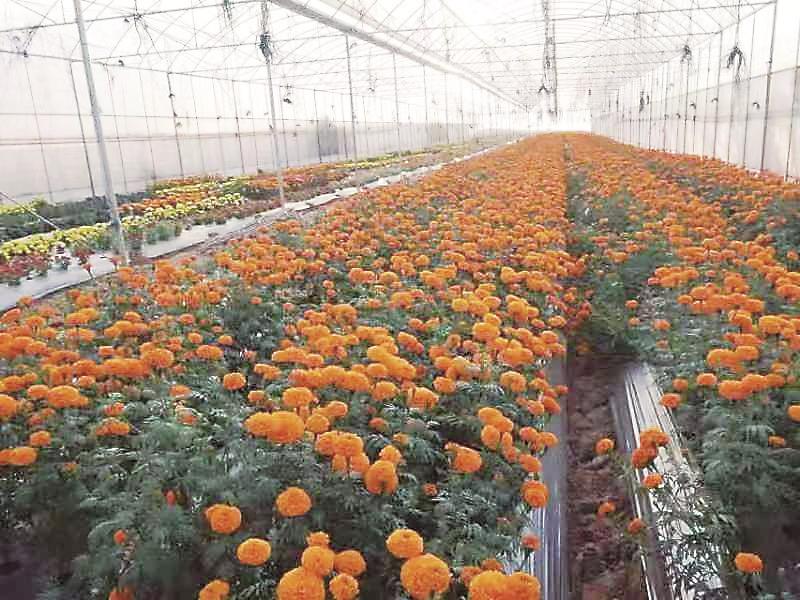 在農(nóng)安縣三盛玉鎮(zhèn)三盛玉村的花卉大棚內,滿是準備移栽的萬壽菊(資料圖片)