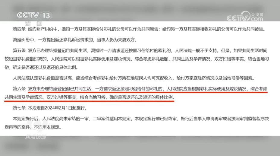 陜西省韓城市人民法院芝陽人民法庭庭長王春妮:“我們跟原告充分釋法明理,讓他知道咱們國家有新的規(guī)定,對他經過反復做工作,他也降低了自己的心理預期。被告這邊認為我跟你在一起共同生活了,我也是實心想跟你過日子,但是因為沒有領證,而且我還跟你共同生育了一個孩子,你現在要求我給你返還彩禮,我就不愿意返還,心里有抵抗情緒?!?br/>
