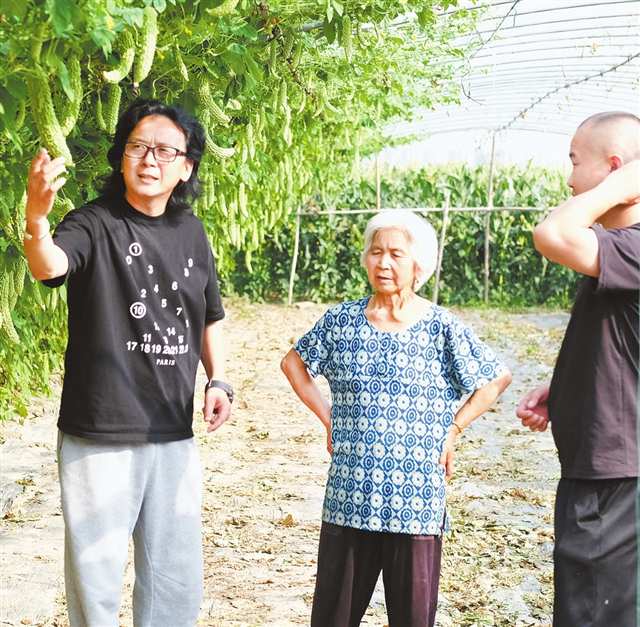 經營民宿多年的劉曉波(左一)與潼南區(qū)小舟村村民查看蔬菜生長情況(受訪者供圖)