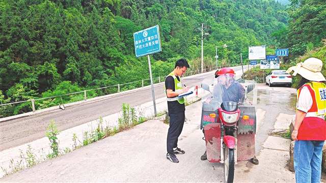 開州香腸隊隊員陳斌(左一)正在鶴林村進(jìn)行交通安全勸導(dǎo) 記者 劉沖 攝