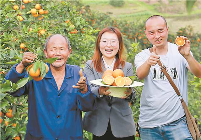 游莉(中)和村民一起直播,吆喝墊江的優(yōu)質柑橘(受訪者供圖)