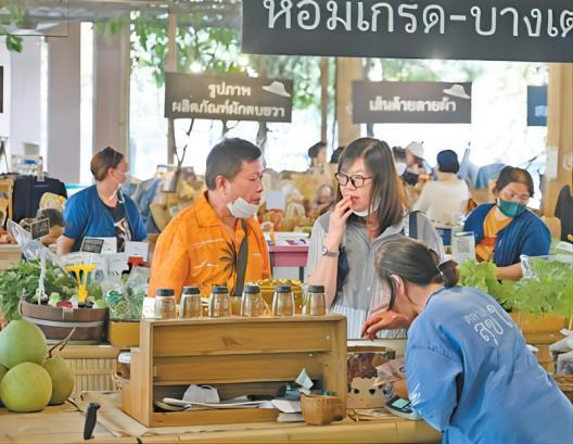 在泰國一家綠色農(nóng)場內(nèi)的農(nóng)產(chǎn)品市場,游客在品嘗和購買新鮮有機農(nóng)產(chǎn)品 記者 白元琪 攝