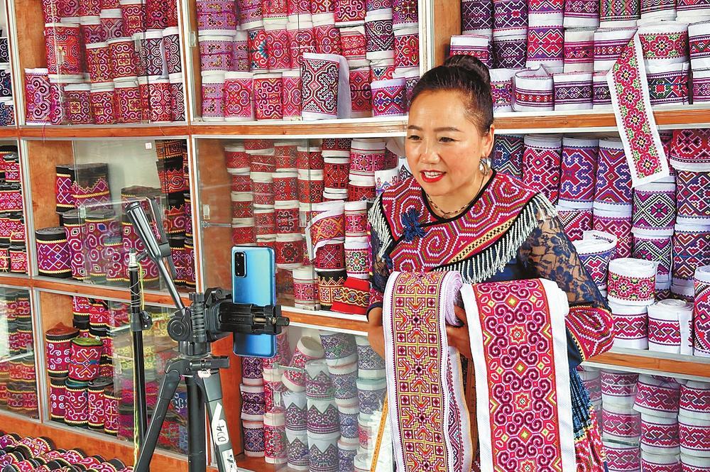 雨后的荷塘邊,趙凱晨身穿壯族傳統(tǒng)服飾,架起手機(jī),擺上水竹花傘,開(kāi)啟了直播?!皞闵系膱D案是我們壯族的壯錦,有人丁興旺的寓意,送親戚送朋友都很好?!壁w凱晨是丘北縣壯學(xué)會(huì)理事長(zhǎng),多年潛心學(xué)習(xí)和研究壯文化,介紹產(chǎn)品時(shí),對(duì)民族文化信手拈來(lái),吸引了不少網(wǎng)友觀看。