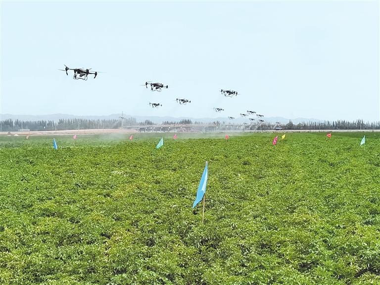 永昌縣聯(lián)聯(lián)眾力農(nóng)機(jī)農(nóng)民專業(yè)合作社正在進(jìn)行無人機(jī)飛防作業(yè) 記者 馬國順