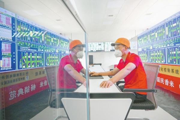 湖南生平米業(yè)股份有限公司的工作人員通過遠(yuǎn)程智能化自動生產(chǎn)大米 記者 郭立亮 攝
