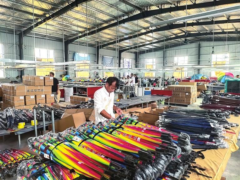 腰店鎮(zhèn)黨委書(shū)記李宗萬(wàn)介紹:“目前,零件加工、傘架組裝、成傘裝配、圖文印刷等工序均能在腰店鎮(zhèn)生產(chǎn),傘布就地集采鄧州市區(qū)化纖紡織企業(yè)產(chǎn)品,形成了‘城里紡化纖、鄉(xiāng)下做雨傘,雨傘用化纖、城鄉(xiāng)共發(fā)展’的合作共贏局面,全產(chǎn)業(yè)鏈已基本形成?!?/p>