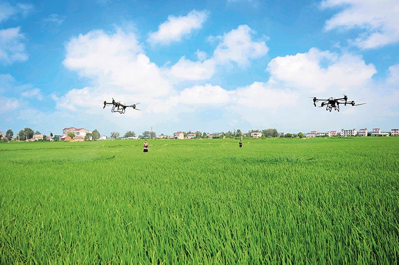 在安徽五河縣澮南鎮(zhèn)楊集村,“新農(nóng)人”使用無(wú)人機(jī)為水稻噴灑農(nóng)藥(2023年8月1日攝)黃博涵攝