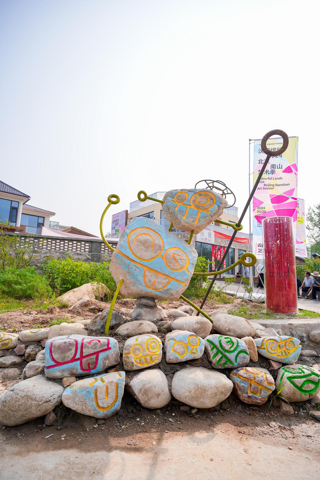 如今,南山村村口灰撲撲的石頭圍墻變成了一面豐收墻,大家把石頭涂畫成白菜、柿子、大桃等果蔬的樣子;清華美院在胡同安裝了交互感應(yīng)裝置,夜晚有人走過,就會投射出一只奔跑的夜光兔子;北京林業(yè)大學(xué)用玻璃飲料瓶復(fù)現(xiàn)了村里曾經(jīng)出土的文物石馬,名為《馬放南山》……環(huán)境變好了,加上南山藝術(shù)季的帶動(dòng)效應(yīng),村民的柿子、山里紅、核桃也都賣出去了,鄉(xiāng)村建設(shè)還讓村里的石匠、瓦工有了在家門口掙錢的機(jī)會。