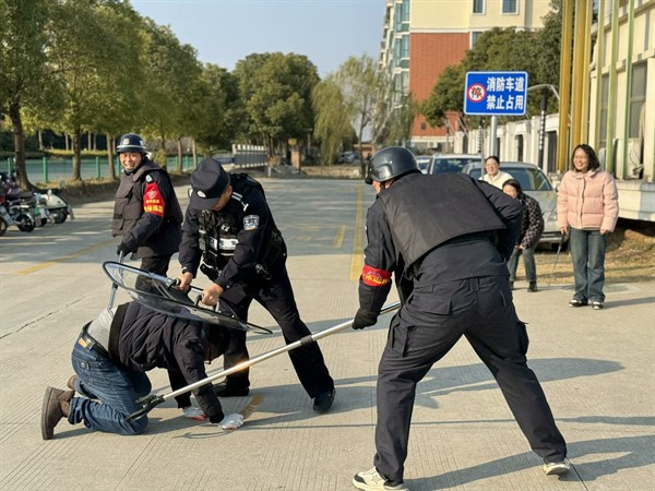 演練期間,一名佯裝以探視幼兒為借口的“歹徒”,手持器械妄圖強(qiáng)行闖入校園。面對這一“不速之客”,校園保安迅速反應(yīng),當(dāng)即對歹徒予以勸阻,并即刻啟動(dòng)一鍵報(bào)警系統(tǒng)向公安機(jī)關(guān)報(bào)警,同時(shí)向園內(nèi)應(yīng)急指揮部匯報(bào)情況。相關(guān)責(zé)任教師在警報(bào)拉響后,迅速且有條不紊地將正在戶外開展活動(dòng)的幼兒疏散至安全地帶。應(yīng)急小組、校園保安與在場民警緊密協(xié)作,運(yùn)用防暴盾牌筑起堅(jiān)固防線進(jìn)行格擋防御,借助鋼叉巧妙干擾歹徒的行動(dòng)。憑借彼此間的高度默契配合,逐步縮小對歹徒的包圍圈。在全體現(xiàn)場人員的齊心協(xié)力之下,最終成功將歹徒制服。整個(gè)演練流程各個(gè)環(huán)節(jié)緊密銜接、有條不紊,順利達(dá)成預(yù)期目標(biāo)。