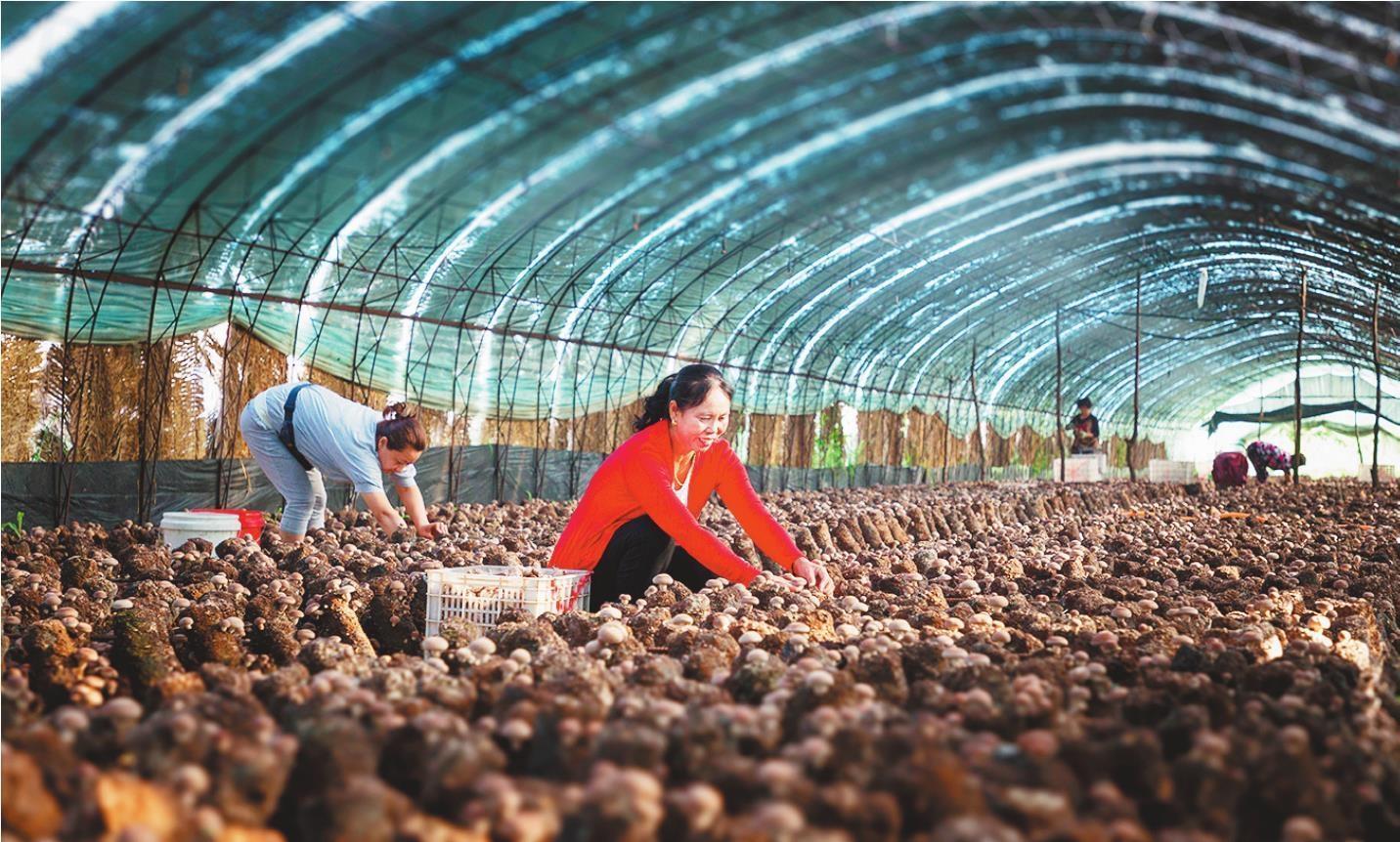 黃土嶺鎮(zhèn)的食用菌生產(chǎn)大棚內(nèi),村民們在采摘香菇