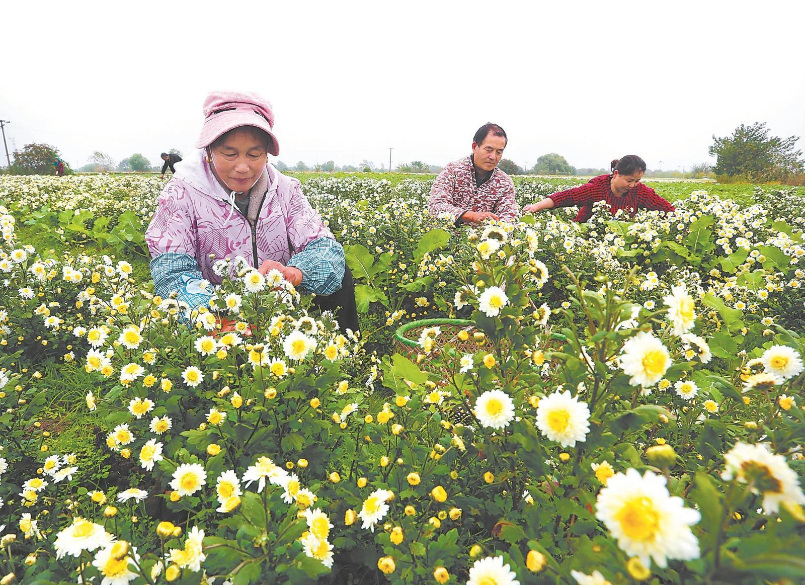 蕪湖三山經(jīng)濟(jì)開(kāi)發(fā)區(qū)峨橋鎮(zhèn)農(nóng)莊村村民在采收菊花 通訊員 王玉實(shí) 攝