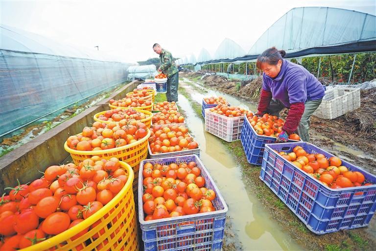 樂安縣山碭鎮(zhèn)流芳村西紅柿種植基地,村民正在搬運(yùn)采摘好的西紅柿 通訊員 邱志超 攝