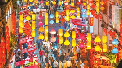 新春佳節(jié)臨近,海南省??谑胁?ài)路年貨一條街張燈結(jié)彩,吸引了眾多市民游客。張茂 攝
