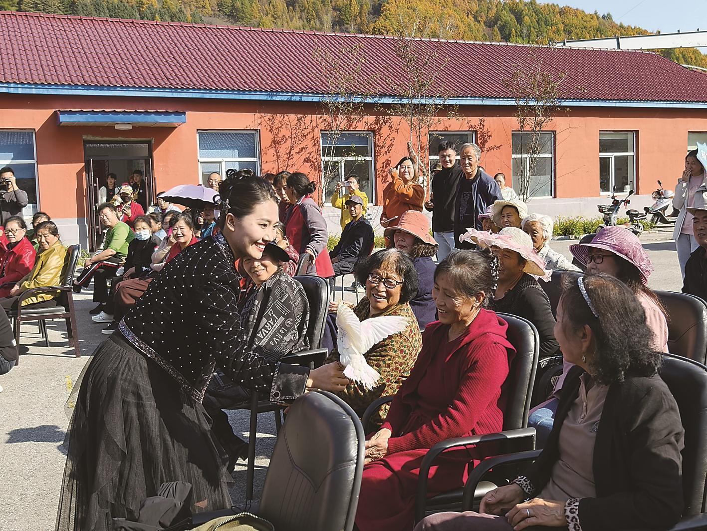 在文藝志愿服務(wù)惠民演出中,文藝志愿者與當(dāng)?shù)卮迕裼H密互動(dòng)。記者 郭悅 攝