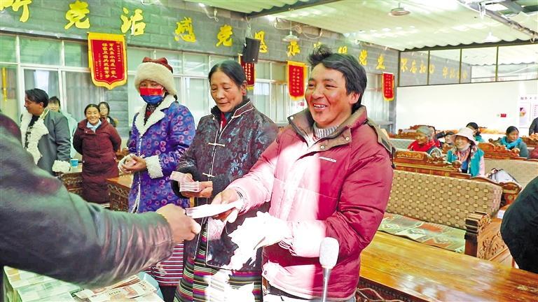 冬日的阿里,寒氣襲人,然而在獅泉河鎮(zhèn)加木村的黨員活動(dòng)室里,卻是暖意融融、熱鬧非凡。原來(lái),這里正在召開(kāi)村里的年終分紅大會(huì)。村合作社經(jīng)理洛桑達(dá)瓦首先向群眾介紹了合作社2024年的運(yùn)營(yíng)及收益情況,隨后按村民入股多少逐戶發(fā)放分紅款??粗掷锏摹罢娼鸢足y”,村民們個(gè)個(gè)笑得合不攏嘴。