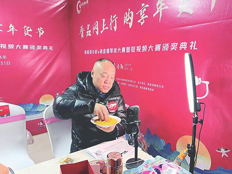 壽陽縣鄉(xiāng)村e鎮(zhèn)直播帶貨大賽中,參賽人員正在直播銷售地方農(nóng)產(chǎn)品(資料圖片)