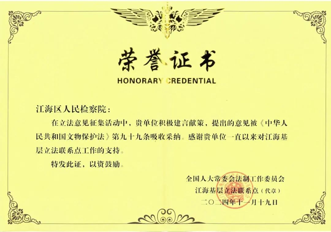 助力“法務(wù)集聚區(qū)”建設(shè),落實“誰執(zhí)法,誰普法”責任制,開展法律“六進”活動60余次。積極履行立法聯(lián)系單位職責,對4部法律修訂草案提出立法建議,其中對文物保護法提出的意見被全國人大常委會法制工作委員會吸收采納。