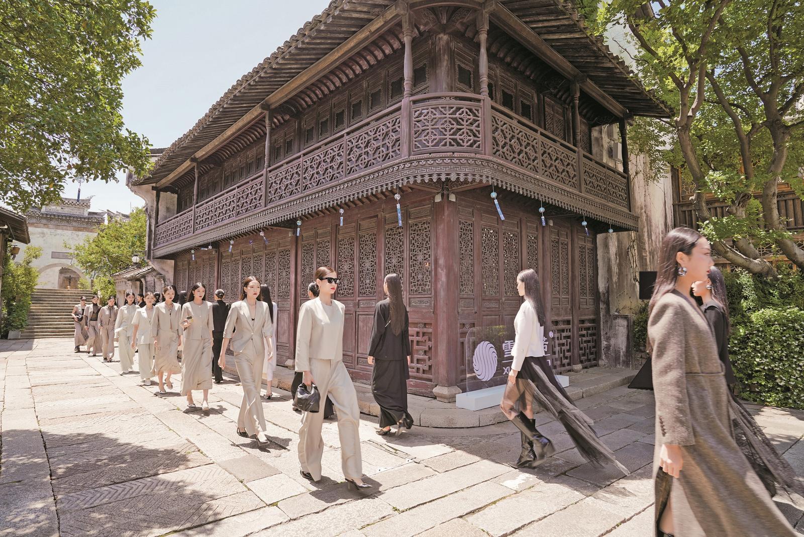 不只是在水上禪堂的室內(nèi)空間,小船上、拱橋旁、街巷中隨時(shí)會(huì)上演一場時(shí)裝秀。5月10日,古鎮(zhèn)當(dāng)?shù)仄放蒲┙q諾的時(shí)裝秀在鳳棲街舉行,路過的游客被邀請(qǐng)來看秀。定位職業(yè)女性的雪絨諾服飾線條簡潔流暢,冷峻高雅,當(dāng)模特從古色古香的中式建筑中款款走出,華美的衣裳、青石板的路面、潺潺的流水、民居的飛檐翹角、鳥兒在樹梢間盤旋著鳴叫……這一幅畫面令人印象深刻。