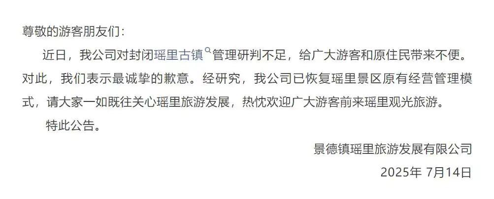 在村民的反對和輿論關(guān)注下,7月14日,江西省景德鎮(zhèn)市瑤里景區(qū)發(fā)布公告稱,近日,我公司對封閉瑤里古鎮(zhèn)管理研判不足,給廣大游客和原住民帶來不便。對此,我們表示最誠摯的歉意。經(jīng)研究,我公司已恢復(fù)瑤里景區(qū)原有經(jīng)營管理模式,請大家一如既往關(guān)心瑤里旅游發(fā)展,熱忱歡迎廣大游客前來瑤里觀光旅游。