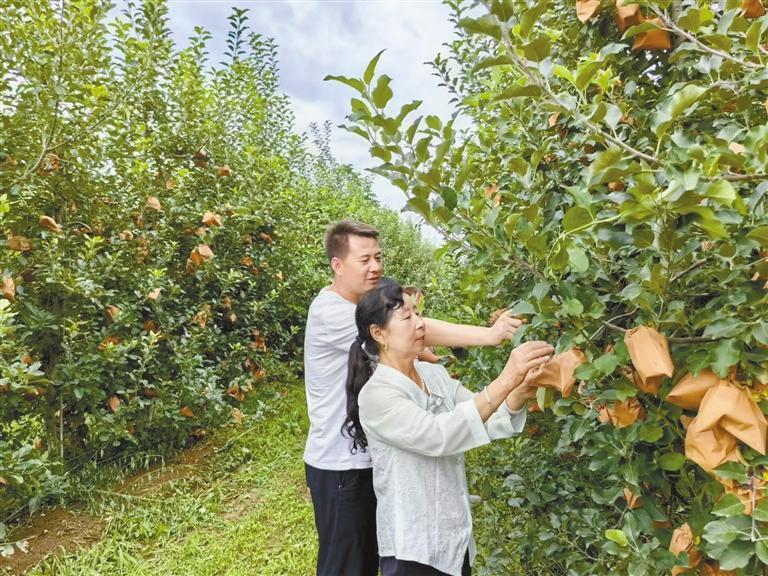 7月23日,韓英杰(左)在蘋果園里指導(dǎo)群眾管護(hù)果樹。記者 李靜茹 攝