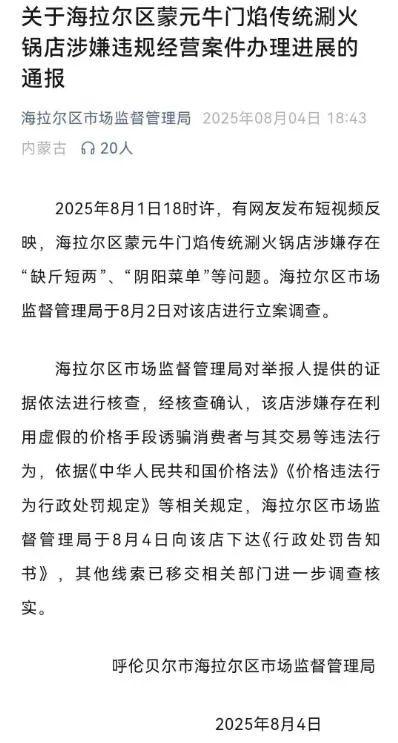 8月2日,海拉爾區(qū)市場(chǎng)監(jiān)管局也展開立案調(diào)查。最新通報(bào)顯示,8月4日,內(nèi)蒙古呼倫貝爾市海拉爾區(qū)市場(chǎng)監(jiān)督管理局針對(duì)涉事火鍋店涉嫌違規(guī)經(jīng)營(yíng)一案向該店下達(dá)了《行政處罰告知書》。