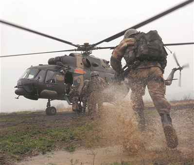 完成火力打擊后,數(shù)架運輸直升機從低空突入戰(zhàn)場,快速實施索降。著陸后,作戰(zhàn)隊員多路并進、奪控要點,并對機降地域縱深之“敵”展開清掃。