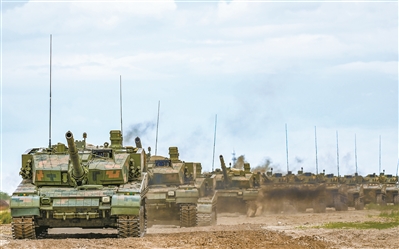 某型突擊車在機(jī)動(dòng)中對(duì)“敵”實(shí)施火力打擊。