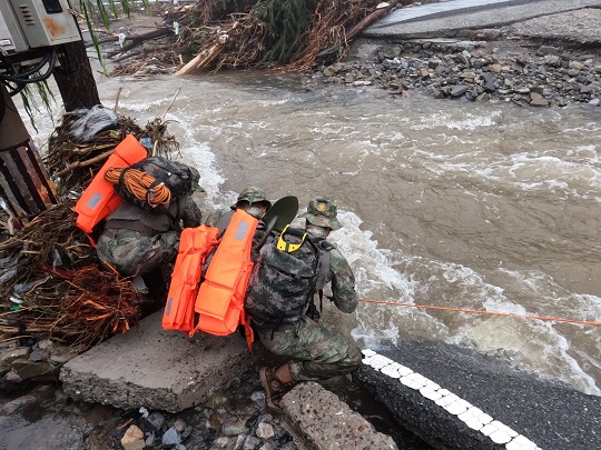 前進路上,折斷的樹木和電線桿倒伏在河道,部分路基被河水全部掏空,路面整段塌陷下去?!翱禳c,再快一點,把情況摸清楚!”朱鵬宇和戰(zhàn)友們在沒過小腿的洪水中加速挺進。