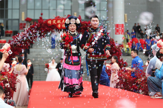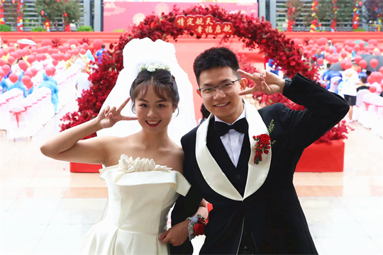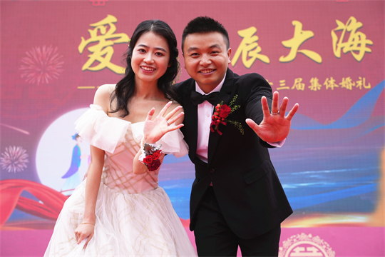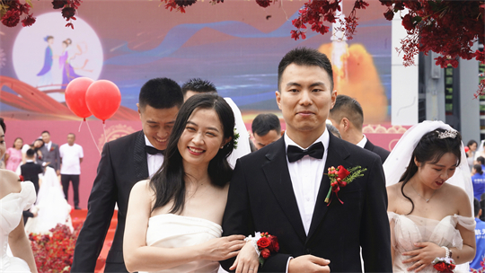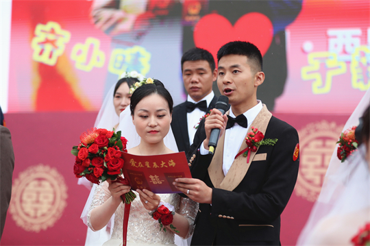 舞臺(tái)、氣球精心裝扮,美景、佳人喜迎幸福……婚禮現(xiàn)場,新郎們身著深色西裝,筆挺英俊;新娘們身穿潔白婚紗,美麗動(dòng)人。一個(gè)個(gè)精心設(shè)置的儀式,一張張洋溢幸福的笑臉,讓這場集體婚禮甜蜜加倍、幸福爆表。