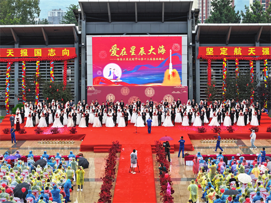 “星辰大海,夢想自有夢想的力量,仰望在銀河的想象,我們起航……”活動(dòng)最后,全體新人與觀禮人員共同合唱《星辰大?!贰墼谛浅酱蠛?,新人們把愛的誓言唱響在航天大院,幸福的歌聲在青山之間久久回蕩……