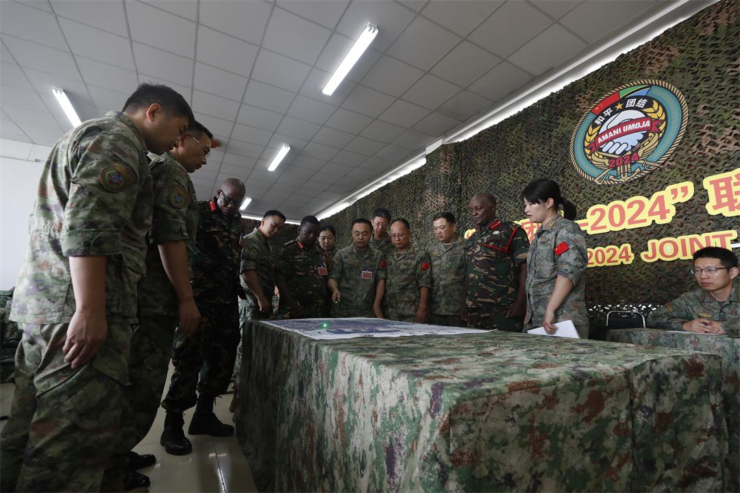 “××鎮(zhèn)周圍發(fā)生恐怖襲擊,請迅速處置……”當(dāng)?shù)貢r間8月4日下午,在坦桑尼亞馬坪加綜合訓(xùn)練中心的“和平團結(jié)-2024”演習(xí)聯(lián)合指揮部內(nèi),中坦兩軍參演部隊正在緊鑼密鼓組織聯(lián)合作戰(zhàn)籌劃。隨著一條條情報信息匯集至指揮信息系統(tǒng),恐怖分子活動態(tài)勢逐漸明朗,各編組依案提出處置建議。
