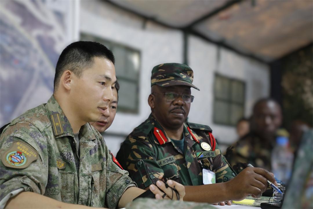 中坦雙方指揮人員共聚一室,同步掌握戰(zhàn)場態(tài)勢,共同組織作戰(zhàn)籌劃,在研判情況、定下決心、制定計劃、組織協(xié)同等環(huán)節(jié)充分溝通,精準(zhǔn)調(diào)控任務(wù)部隊行動。雙方指揮員針對指揮處置重難點問題和臨機導(dǎo)調(diào)情況不時提出質(zhì)詢,雙方指揮編組人員隨即展開臨機籌劃、提出處置建議,整個過程精準(zhǔn)高效、順暢有序。