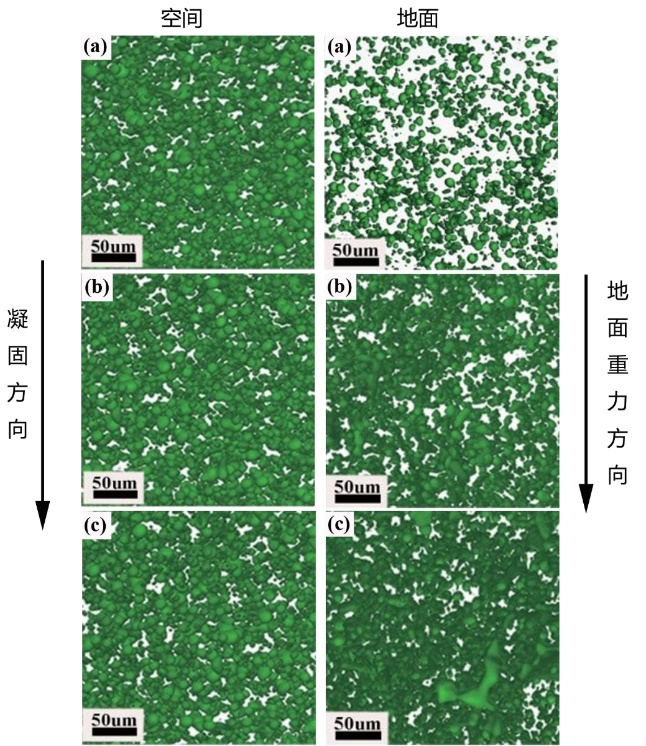 圖1為空間凝固合金呈現(xiàn)彌散型組織,地面凝固合金呈現(xiàn)偏析組織。(a)初始凝固部位;(b)試樣中部;(c)最后凝固位置。